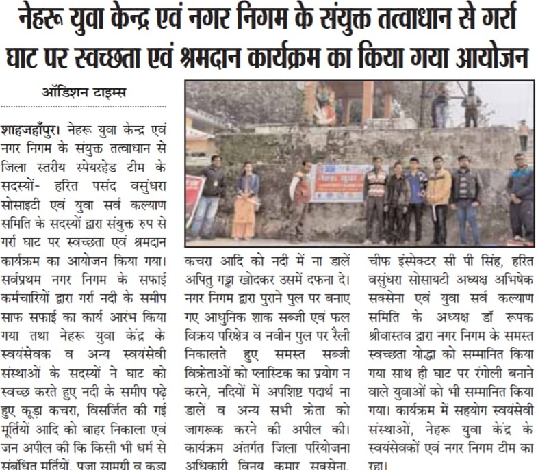 नेहरू युवा केंद्र एवं नगर निगम के संयुक्त तत्वाधान से गर्रा घाट पर स्वच्छता एवं श्रमदान कार्यक्रम का किया गया आयोजन।